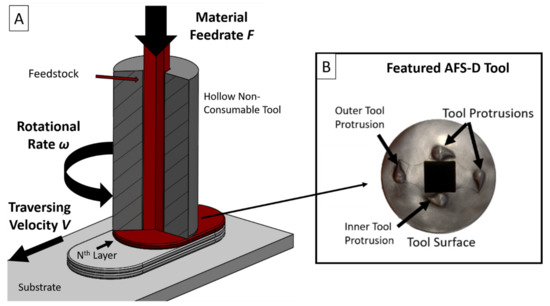 (A). Schematic of the AFS-D process denoting specific features and process control variables. (B) Schematic of the features located on the interaction face of the steel AFS-D tool.