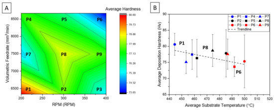 (A). Color contour plot contrasting the material volumetric feed rate to the RPM of the tool. (B) Deposition cross-sectional hardness versus average temperature. Key: circles correlate to 200 RPM, squares to 300 RPM, and triangles to 400 RPM. Blue data points correlate to deposition ratio of 0.55, black data points correlate to a deposition ratio of 0.65, and red data points correlate to a deposition ratio of 0.75.