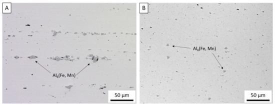 (A). Optical micrograph of wrought AA5083-H131 plate showing constitutive particles pancaked between the rolled grains. (B) Optical micrograph of as-deposited AA5083 after AFS-D showing smaller, dispersed constitutive particles.