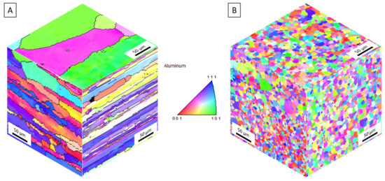 Figure 4A,B depict inverse pole figures displaying the stark reduction in grain size from the AA5083-H131 feedstock and as-deposited AA5083 in the longitudinal/rolling (top), long transverse (right), and short transverse/build (left) directions. The feedstock exhibits typical rolled grains along the longitudinal direction on the order of 250 µm with thin pancaked grains along the transverse directions. Following AFS-D, these grains are refined into 3.16 µm diameter equiaxed grains with a standard deviation of 1.38 µm. As denoted by recent studies of Al-Cu [18], Al-Mg-Si [27,28,47], and Al-Zn Mg-Cu [29,48], AFS-D refines aluminum alloy grain structures via geometric, continuous dynamic recrystallization. Mason et al. [33] established that grain sizes were generally larger in the first layers of the deposit due to the increased thermal exposure as additional layers are built. In this work, AFS-D AA5083 exhibited no noticeable difference in grain size, particularly through the gage section as seen in Figure 4B.