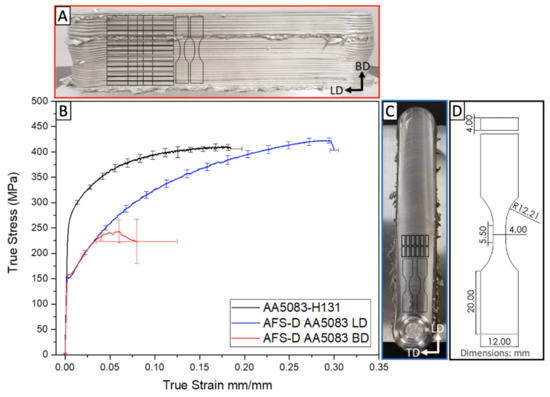 (A). Profile view of AFS-D AA5083 deposit. (B) Comparative tensile stress-strain response of the wrought AA5083-H131 feedstock and as-deposited AA5083. (C) Top view of AFS-D AA5083 deposit. (D). Sample geometry used in this study.
