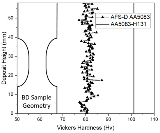 Vicker’s hardness plot with respect to the sample geometry for both AA5083-H131 control and AA5083 processed with AFS-D.