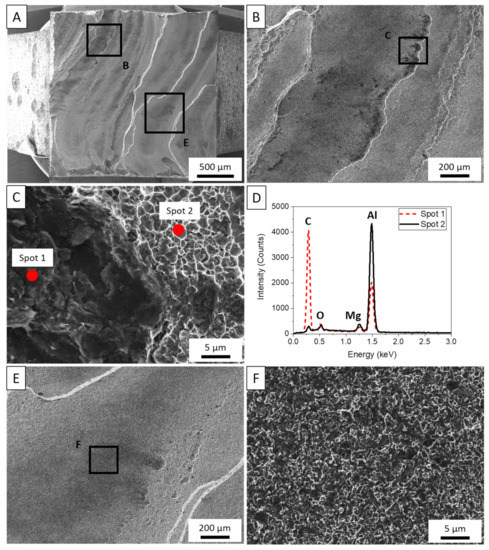 Figure 8A–D depicts a fractured sample tested from the longitudinal direction of the free-standing deposit. A few features are immediately evident in the macroscopic view in Figure 8A. First, cracks appear to be forming approximately 1 mm apart, which is the approximate layer height for each layer in the deposit. Towards the center of the sample, the fracture comes to a point and gradually slopes to the exterior edges of the sample. These paths closely match the rotational pattern of the tool features as the tool traverses in the direction, observed collinearly with the loading direction of this sample. Next, highlighted in Figure 8B, a dark, discolored region is observed at a large crack originating from the exterior surface of the sample. In this region, dimpling appears very shallow as the dark particles fill the dimples. Further discussion of this region is presented later. Between the layer boundaries, material flow lines are observed in Figure 8C and at higher magnification in Figure 8D. This region experiences more traditional fracture where transgranular dimpling surrounds larger voids nucleating from constitutive particles. However, it is observed that rather than uniquely Al6 (Fe, Mn) particles, these platelets more closely resemble that of the β-phase precipitate. Yan et al. [50] found that β would often form as a result of dislocations diffusing Mg atoms towards high-angle grain boundaries (HAGB), particularly in the presence of Al6Mn during deformation processes. In AFS-D of aluminum alloys, it has been noted through various works that the high shear mechanisms of the process typically promote a high density of HAGB proportional to the strain governed by processing conditions [28,29,47]. As a result, the constitutive particles located at grain boundaries also provide preferential locations to precipitate β-phases. In loading conditions, larger voids can be expected to develop as a result of both Al6 (Fe, Mn) and Al3Mg2 particles.