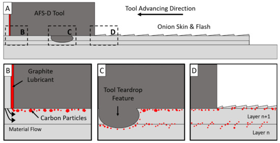 (A). Overview schematic of the cross section of the AFS-D tool, feedstock, and two layers. (B) Schematic of the material flow close to the tool exit hole. Carbon highlighted in red. (C) Schematic of the area near a tool teardrop feature. Carbon follows the path of the tool features rather than dissolving into the layers. (D) Carbon on the active layer becoming entrapped by the flash from excess material in the onion skin.