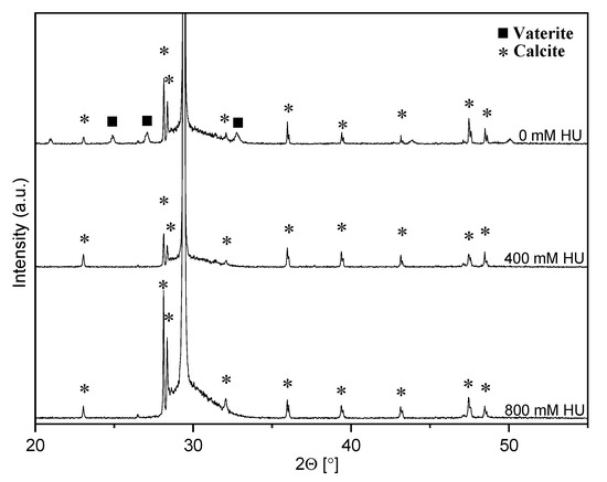 Previous attempts have been made to load different drugs and molecules into calcite crystals. The majority of these studies resulted in hybrid microparticles, where the drug molecule is adsorbed onto the surface [8,9]. A study by Kim et al. showed entrapment of 6.9 mol% of amino acids into the crystal structure of calcite [10]. However, the addition of amino acids resulted in a change of morphology where the calcite corners were smoothed out. It is known that amino acids tend to adsorb to the calcite surface as the amino group can interact with the carbonate groups and the carboxylic group can interact with the calcium ions [11]. In the present study, HU is used, which is a slightly basic molecule with a pKa of 10.15. The functional groups and the basicity of HU imply that no adsorption would occur at the calcite crystal surface, meaning that all of the HU will be within the crystal structure. The total amount of loaded HU for 400 mM and 800 mM was calculated to be 0.019 mol% and 0.016 mol%, respectively. These amounts are significantly lower compared to Kim et al., however in this study, the drug is incorporated into the crystal structure without any adsorption to the surface.