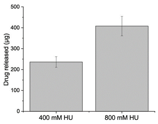Higher initial concentrations of HU resulted in a higher amount of loaded HU, Figure 4. The amount of drug detected are shown in Table 2, where the loading efficiency (mol%) was calculated from the release concentration dived by the starting concentration. Drug release at pH 7.4 (PBS solution) was conducted for two weeks. For all formulations, no drug was detected at pH 7.4, confirming that drug release did not occur at neutral pH.