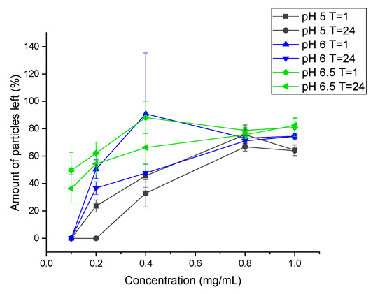 The dissolution of particles was investigated, visually and quantitatively, to determine what pH (1–6.5) was sufficient to dissolve each particle concentration (0.01–50 mg/mL) in order to achieve maximum drug release. Particle dissolution was conducted in well-plates and acidified DMEM/F12 cell media for up to 24 h in 37 °C. For visual investigation, images were taken with the microscope of the wells at different time points: 0, 1, and 24 h. To quantify the amount of particles dissolved, light absorbance was measured (λ = 560 nm) with the same dissolution time points.