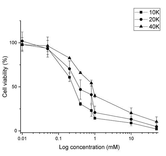 Cell viability studies are typically conducted on cells that are actively dividing in the linear range of logarithmic division. However, tumors are typically dense, highly populous three-dimensional cultures. The EC50 value for a given drug can differ greatly between cell concentrations as lower density cultures are more susceptible to drug-induced toxicity. Therefore, HU toxicity was validated using three different cell concentrations, 1 × 104, 2 × 104, and 4 × 104 cells/well (Figure 7). The observed EC50 values of HU in MCF-7 cells was 0.2 mM for cells cultured at 1 × 104/well, 0.4 mM for cells cultured at 2 × 104/well, and 0.8 mM cells cultured at 4 × 104/well.