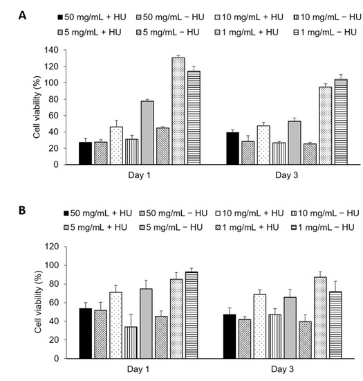 Cell viability after treating 20,000 cells/well (A) and 40,000 cells/well (B). The cells were treated with 50 mg/mL, 5 mg/mL, 10 mg/mL, and 1 mg/mL. For each concentration, particles with (+) and without (−) Hydroxyurea was tested. (Mean ± SD, n = 6).
