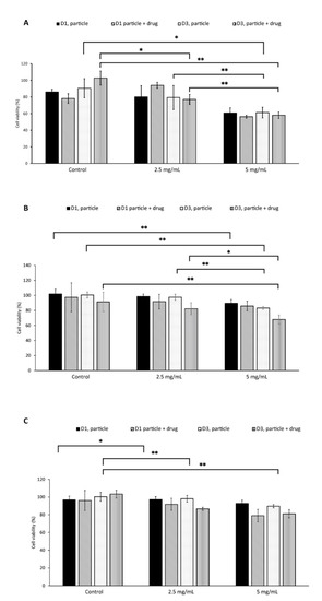 Cell viability after particle solution treatment for 10,000 cell/well (A), 20,000 cells/well (B), and 40,000 cells/well (C). The cells were treated with 2.5 mg/mL and 5 mg/mL. For each concentration particle with (+) and without (−) Hydroxyurea was tested. All p values listed used the parametric ANOVA and Tukey posthoc analysis, n = 6, * indicates p < 0.05, and ** indicates p < 0.01.