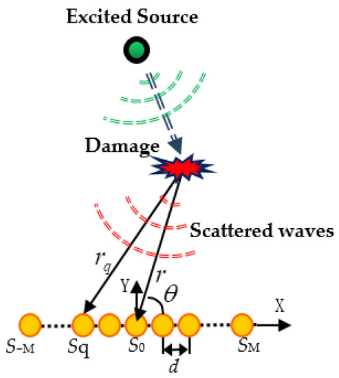 In this paper, the observation signal consists of a uniform linear array of piezoelectric sensors with a space of d as shown in Figure 1. Assuming the scattered waves induced by damages with a certain frequency of , PZTq under the near-field situation can be presented as