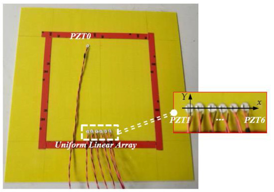 The series of experiments were carried out in order to investigate the environmental condition effect on piezoelectric sensors array based damage imaging method. As seen in the Figure 2, the environmental experiments were carried on an epoxy laminate plate with a dimension of 400 mm 400 mm, and the ply sequence is [02/904/02]S, the thickness of each ply is 0.125 mm. A uniform linear array (ULA) is bonded on the epoxy laminate plate surface, which consists of 6 PZTs and are labeled as PZT1, PZT2..., PZT6 respectively from the left to the right, and the distance between adjacent PZT center is 1 cm. Another single PZT upon the array is labeled as the excitation sensor PZT0 to simulate the scattered waves induced by damages, and the distance between PZT0 and PZT1 is 250 mm.