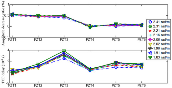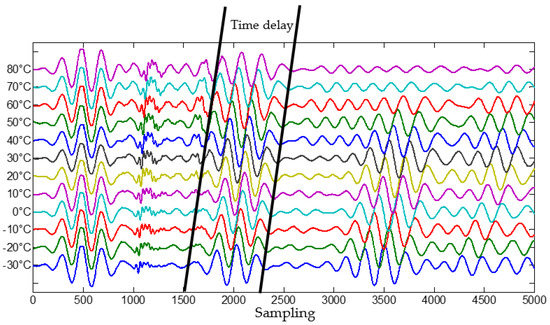 The received Lamb wave array signal at −30 to +80° at the frequency of 50 kHz are shown in Figure 4. It can be observed that the times of flight (TOF) of Lamb wave present an obviously delay when the temperature vary from −30° to +80°, and the amplitude of Lamb wave decreases with increase temperatures. Therefore, the temperature delays the TOF of Lamb wave which will result in false the scattered signal arriving time difference in Equation (3). By comparing the TOF of Lamb wave propagation at a normal temperature, TOF delay ratio of each array element vs. temperature, PZT 1–PZT 6, could be obtained which shown in Figure 5. It shows that the time delay of each PZT is almost proportion to temperature increasing, and the time delay induced by temperature could be denoted as weights vector, that is the gain-phase errors matrix in Equation (6).