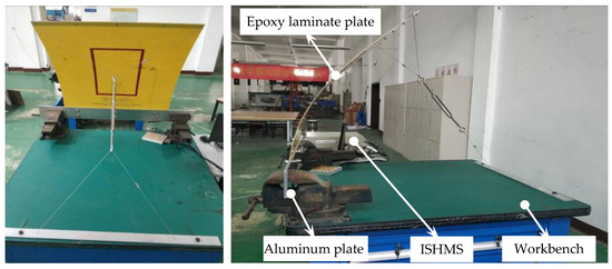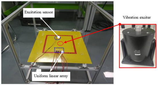The schematic of experimental setup for vibration testing is shown in Figure 6. The working frequency range of vibration exciter is 1 Hz to 1600 Hz. The vibration exciter loaded at the center of the plate under four edges clamped condition. The sizes of epoxy laminate plate, sensor arrangements and systems parameters in ISHMS are same as the frontal experiment.