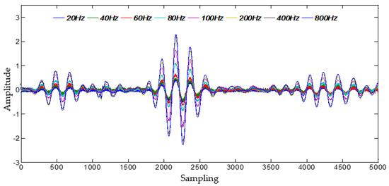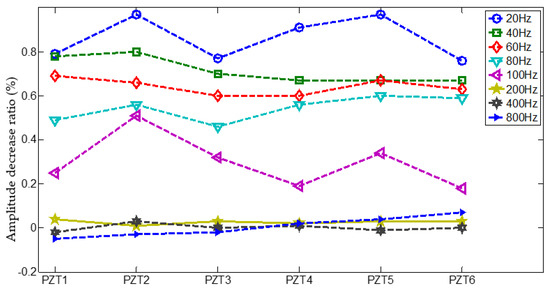 A comparison of PZT 1 sensor signals with vibration at different Hz frequency are given in Figure 7. As seen in figure, it can be observed that for all sensor signals with vibration at different Hz frequency, the time of flight (TOF) of Lamb wave fluctuate slightly as the vibration frequency varies, but the amplitude of Lamb wave decrease at higher Hz vibration. More details about the extracted amplitude decrease ratio comparing with the signal in static condition are shown in Figure 8. It is clear in figure that the amplitude of each of PZT sensor signal at high frequency (200–800 Hz) almost remained intact, but at low frequency (20–100 Hz) decreased significantly, and the amplitude of each of PZT sensor signal changed inconsistently. Therefore, the amplitude decrease ratio could be denoted as weights vector induced by vibration, that is the gain-phase errors matrix in Equation (6).