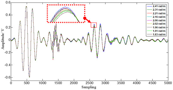 A comparison of PZT 1 sensor signals with different loading conditions is given in Figure 10. It can be observed from figures that their shape does not change significantly when applied load changes. The amplitudes of each PZT signal increase and the TOF decrease as the load increases. The amplitudes and TOF magnitude of each PZT of sensor array change are different due to the different propagation path. Here, we defined the gain-phase errors contrast caused by loading and demonstrated in Figure 11.