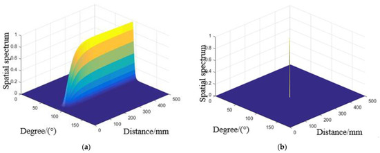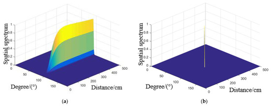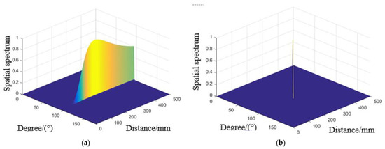 Spatial spectrum estimated for 50 °C by (a) Stander 2D-MUSIC (b) Compensated 2D-MUSIC.