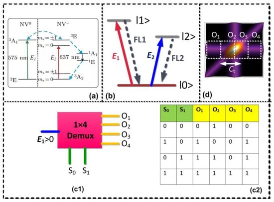 (a) Energy level diagram of NV− interacting with laser pumping fields. (b) Three-level (V-type) atomic system in NV− and laser coupling configuration. (c1) One to four demultiplexers with two selection lines (S0 and S1) to determine one of the four outputs (O1–O4). (c2) The corresponding truth table for the proposed demultiplexer. (d) Theoretical simulation of the third-order correlation function, where bright and dark state represents “Logic 1” and “Logic 0”, respectively. In this device, the positions on the correlation curve labeled as O1–O4 were defined as the four-output terminal and Ct is controllable channel bandwidth.