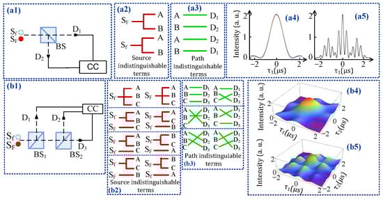 (a1,b1) Experimental setup to measure second- and third-order temporal intensity–noise correlation function of pseudo-thermal light, respectively. SF and Sf: pseudo-thermal sources. BS: 1:1 non-polarizing beam splitter. D: Detector. (a2,b2) Source indistinguishable terms for the second- and third-order correlation, respectively. (a3,b3) Possible path indistinguishable terms for second- and third-order correlation, respectively. (a4,a5) and (b4,b5) Calculated second- and third-order temporal correlation function, respectively.