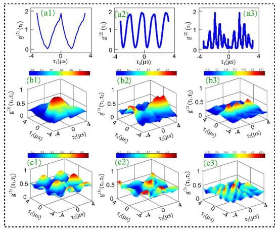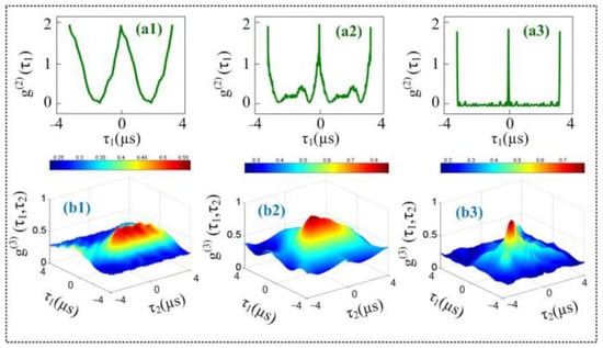 Herein, we investigated interference in two- and three-mode intensity noise correlation by treating fourth-order FL from the NV− center as pseudo-thermal sources (Sf and SF). The fourth-order FL signals are generated by two beams E1 and E2 in a V-type level system (see Figure 1b). Figure 3a shows interference in the two-mode correlation function (plotted as a function of time delay ) when t1 time offset is fixed at 0 μs and power of E1 is changed from low (1 mW) to high (5 mW). In the current experiment, the frequencies of two pseudo-thermal sources are almost degenerate , and the frequency beating term is approximately equal to 1. Thus, the correlation function mainly shows two-mode bunching peaks, as shown in Figure 3(a1). According to Equation (3), the waveform of the correlation function is determined by and can be controlled by the bandwidth of pseudo-thermal source. When the power of E1 is changed from 1 mW to 5 mW, the two dominant peaks, which are assessed by the superposition of the two two-mode bunching, interfere constructively and the waveform of is changed from broad (Figure 3(a1)) to sharp (Figure 3(a3)). When the power of E1 is increased, the splitting space between the dressed energy levels ( + ) increases owing to the strong dressing effect mentioned in Equation (1). As a result of population redistribution in the dressed state, the lifetime decreases and bandwidths of the corresponding peaks increase, as shown in Figure 3(b3). As the bandwidth of two pseudo-thermal sources is gradually increased, the period of the term in Equation (3) gradually decreases. As a result, the bunching peak becomes more sharp, as shown in Figure 3(a3). Figure 3(b1–b3) shows a similar interference phenomenon for third-order correlation as described for second-order correlation in Figure 3(a1–a3).
