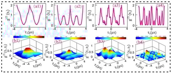 In Figure 5, correlation curves are plotted by varying the wavelength of pseudo-thermal source Sf from 575 nm to 637 nm, and fixing SF at 575 nm. When two pseudo-thermal sources are almost degenerate (Figure 5(b1)), i.e., , three-mode bunching is dominant, and the frequency beating term is approximately equal to 1. Thus, the third-order correlation function mainly shows a dominant center peak caused by three-mode bunching. As the frequency of pseudo-thermal source Sf increases, the interference term becomes more prominent in the temporal correlation function in Equation (3). We can see that the dominant center peak becomes sharper and, simultaneously, the secondary peaks are enhanced as shown in Figure 5(b3). The secondary peaks can be attributed to quantum path interference between the three two-mode mode bunching and one three-mode bunching. With the frequency of source Sf increasing further, the correlation peak shows strong interference peaks and the number of peaks increases dramatically, as illustrated in Figure 5(b4). This result is caused by the combined effect of three-mode bunching and second- and third-order quantum beating. From Equations (2) and (3), we can see that interferences in both second- and third-order correlation are determined by . The oscillation frequency of secondary peaks is proportional to the frequency deference . Thus, the number of peaks increases with the increase in frequency deference.