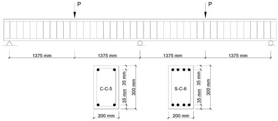 Two continuous RC beams tested by Ashour and Habeeb [] were selected. One beam was reinforced with CFRP bars (designated as C-C-5), while the other beam was reinforced with steel bars (designated as S-C-6). Both beams were of a rectangular section (200 × 300 mm), continuous over two spans (2750 mm for each span) and subjected to center-point loading symmetrically applied on the spans, as shown in Figure 1. In Beam C-C-5, two CFRP bars with a diameter of 12 mm were provided in both the top and bottom layers of the beam. In Beam S-C-6, four steel bars with a diameter of 12 mm were provided in both the top and bottom layers of the beam. Both specimens were provided with shear reinforcement consisting of steel bars that are 8 mm diameter, with a spacing of 140 mm. The rupture strength, rupture strain and elastic modulus of CFRP bars were 1061 MPa, 0.53% and 200 GPa, respectively. The yield strength and elastic modulus of steel bars were 510.8 MPa and 200 GPa, respectively. The value of fck was 28 MPa for Beam C-C-5 and 26.3 MPa for Beam S-C-6.