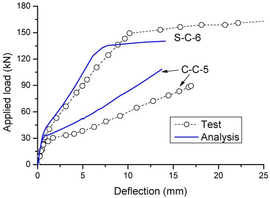 According to the numerical analysis, crushing failure happens in Beam S-C-6 (i.e., concrete at midspan reaches its ultimate compressive strain of 0.0035), while the rupture failure of CFRP bars takes place in Beam C-C-5 (i.e., CFRP bars at center support reach their rupture strength of 1061 MPa). These failure modes of the specimens are consistent with the experimental observations. The predicted load–deflection behavior of the specimens is compared to the experimental results in Figure 2. It is observed that the post-cracking stiffness by the numerical analysis appears to be higher than the experimental one, while the difference is more apparent for the CFRP RC beam (C-C-5) than for the steel RC beam (S-C-6). This can be explained by the fact that the bond-slip effect, which is more important in CFRP bars than in steel bars, is neglected in the numerical modeling. In addition, the numerical model does not account for the confinement effect in concrete, leading to substantial underestimate in the ultimate deflection in steel RC beams failing by concrete crushing. Despite some discrepancy, the numerical model can capture reasonably the key response characteristics of both specimens (i.e., cracking, yielding and crushing in Beam S-C-6; and cracking and rupture in Beam C-C-5).