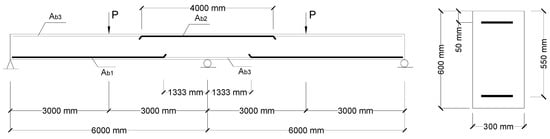 Two-span RC beams under center-point loading symmetrically applied on the spans, as shown Figure 3, were used. The investigated variables are the type of bars (CFRP and steel) and the bar ratio. The arrangement of reinforcing bars is as follows: ρb1/ρb2 = 1.5, ρb2 = 0.61–3.03% and ρb3 = 0.36%, where ρb1, ρb2 and ρb3 are ratios of tensile bars over positive, negative moment regions and compressive bars, respectively. The bar ratio is defined by ρb = Ab/(bdb), where Ab is the bar area, b is the cross-sectional width and db is the distance from the centroid of tensile bars to the extreme compressive fiber of the cross-section.