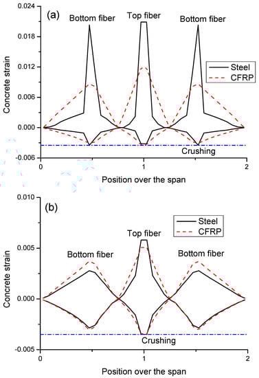 Failure of CFRP and steel RC beams occurs when the critical section reaches the ultimate concrete compressive strain of 0.0035 (see Figure 4). For steel RC beams, crushing failure transits from the midspan to the center support when the bar ratio increases from a low to high level. For CFRP RC beams, the beam concrete is crushed at the center support, regardless of the bar ratio. At ρb2 = 0.61%, CFRP bars are close to their rupture strength when crushing failure happens, indicating an approximately balanced ratio of CFRP bars.