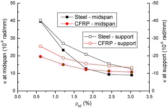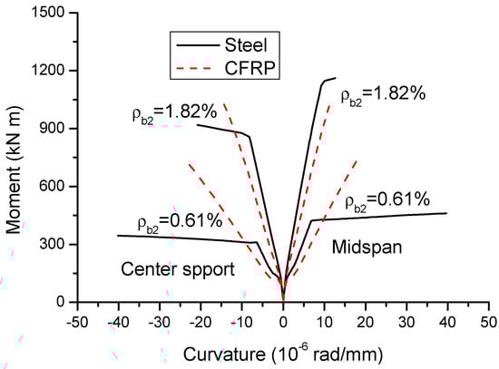 Figure 5 shows the moment–curvature curves of CFRP and steel RC beams with ρb2 = 0.61 and 1.82%. It is clearly demonstrated that steel RC beams exhibit three-stage moment–curvature behavior. Each stage is represented by an approximately linear segment, while each stage transition is featured by a marked reduction in bending stiffness. The first stage, characterized by the elastic behavior, continues up to the occurrence of cracking, followed by the elastically cracked stage until yielding of steel and then by post-yielding stage up to the structural collapse. CFRP RC beams experience only the first and second stages, due to the lack of yielding of FRP bars. Steel and CFRP RC beams behave identically in the first stage, while, in the second stage, steel RC beams show a stiffer behavior than CFRP RC beams attributed to the modulus difference between steel and FRP bars.