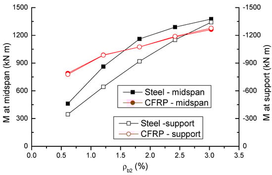 The variation in ultimate moments (M) at midspan and center support with varying ρb2 is shown in Figure 7 and presented in Table 1. In steel RC beams, the moment at center support is lower than that at midspan, attributed to the fact that a smaller bar area is provided in the hogging region compared to the sagging region. In CFRP RC beams, however, the moments at midspan and center support are almost identical. This can be explained by the fact that a higher stress in CFRP bars at the center support is achieved in failure, thus compensating the smaller bar area in the section. At a low ρb2 level of 0.61%, CFRP RC beams show significantly (i.e., 71.5% at midspan and 125.5% at center support) higher moments than steel RC beams. With an increase in ρb2 level, the increase in moments in CFRP RC beams is slower than that in steel RC beams, attributed to an apparent decrease in stress in CFRP bars. Consequently, CFRP bars may result in lower moments than steel bars at a high ρb2 level.