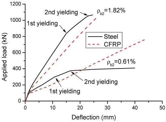 Figure 8 shows the load–deflection behavior of CFRP and steel RC beams with ρb2 = 0.6 and 1.82%. Similar to the moment–curvature behavior, the load–deflection curve of CFRP RC beams consists of two stages, namely elastic stage controlled by concrete and post-cracking stage dominated by tensile bars. Each stage is featured by a straight line. For steel RC beams, the first yielding at the center support has limited influences on the load–deflection response, while the second yielding at midspan leads to a remarkable reduction in structural stiffness.