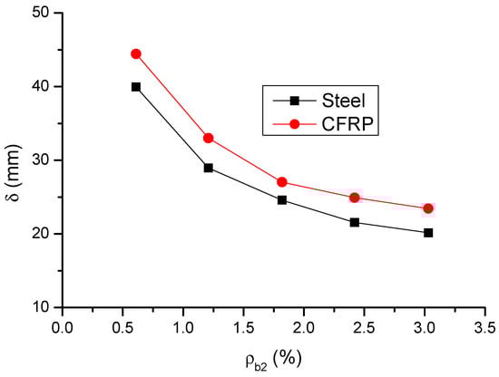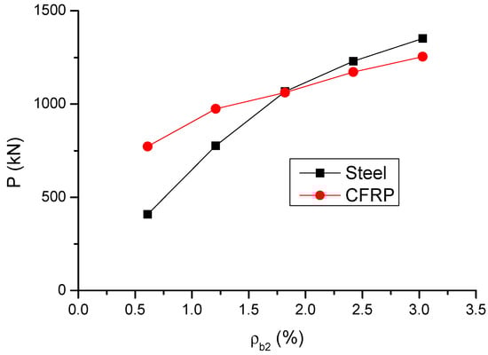The variation in the ultimate load (P) and deflection (δ) with varying ρb2 is shown in Figure 9 and Figure 10, respectively. The results are also presented in Table 1. It is observed that, as ρb2 increases, the enhancement of the ultimate load of CFRP RC beams is not as apparent as that of steel RC beams. At a low ρb2 level of 0.61%, the ultimate load of CFRP RC beams is significantly (89%) greater than that of steel RC beams, attributed to that CFRP bars develop substantially higher stress than steel bars. However, at ρb2 = 3.03%, the ultimate load of CFRP RC beams turns to be 7.2% lower than that of steel RC beams. The ultimate deflection of CFRP RC beams is around 13% greater than that of steel RC beams over the entire ρb2 levels investigated.