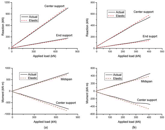In CFRP RC beams, the post-cracking reaction or moment develops linearly with increasing load up to failure, as illustrated in Figure 11a. In addition, over the entire inelastic range of loading, the deviation between actual and elastic reactions or moments is not apparent, indicating a low redistribution of moments in these beams. In steel RC beams, yielding of steel bars may play a critical role in the development of reaction and moment, leading to substantially more deviation between actual and elastic values when compared to CFRP RC beams. Upon the first yielding of steel bars at the center support, further moments are redistributed away from the center support, leading to a further growth of the rate of increase in end support reaction and midspan moment, and correspondingly, a further diminution of the rate of increase in center support reaction and moment, as illustrated in Figure 11b. When steel bars at midspan begin to yield, moments turn to be redistributed from the midspan towards the center support, thereby resulting in a diminution of the rate of increase in the end support reaction and midspan moment, while there is a growth of the increase rate of the center support reaction and moment.