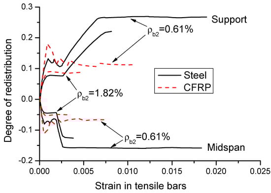 - CFRP RC beams show lower moment redistribution due to the lacking of yielding, when compared to steel RC beams. The redistribution difference between CFRP and steel RC beams is notable at a low ρb2 level and becomes less important with increasing ρb2.