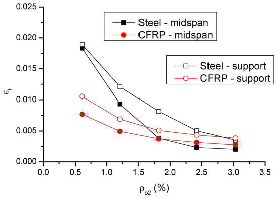 Figure 4a shows that, for steel RC beams with a low ρb2 level of 0.61%, there appear large concrete tensile strains at the critical sections against relatively small ones over other regions, indicating marked cracking concentration. By using CFRP bars instead of steel bars, the tensile strain distribution or the crack mode is greatly improved, i.e., the crack concentration is relieved and the crack region is more extended. Therefore, it can be concluded that, if concrete beams are lightly reinforced, replacing steel bars with CFRP bars can lead to significant improvement in the crack mode. Figure 4b demonstrates that, at a high ρb2 level of 2.42%, the maximum tensile strains in the critical sections in both CFRP and steel RC beams are small and the strains over other regions exceed the cracking strain, indicating that small cracks appear all over the beam. CFRP RC beams show a slightly greater crack width at midspan but a slightly smaller crack width at the center support, as compared to steel RC beams.