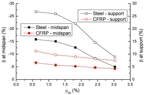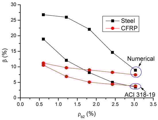 Figure 16 shows a comparison of code and numerical predictions regarding the β-ρb2 relationship for CFRP and steel RC beams. It can be observed that ACI 318-19 can reflect the influence of bar ratio on moment redistribution in RC beams. In addition, according to ACI 318-19, CFRP RC beams generally exhibit lower moment redistribution than steel RC beams; this is especially notable at a low ρb2 level. This observation is also consistent with the numerical results. Therefore, the effect of bar type on moment redistribution is also reflected in ACI 318-19. From Figure 15 and Figure 16, it is seen that ACI 318-19, which is shown to be conservative, leads to more accurate predictions of moment redistribution in CFRP RC beams than that in steel RC beams.
