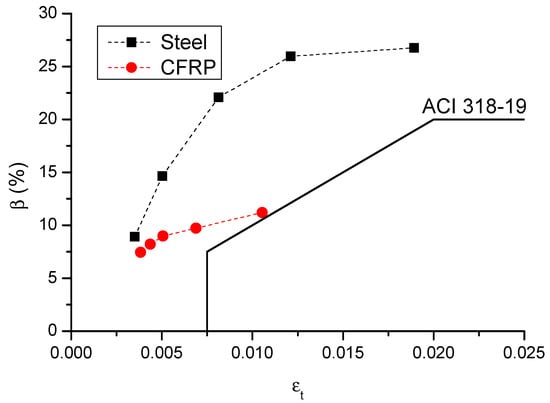 When calculating the design moments in continuous RC beams, the current design codes permit an elastic analysis with an adjustment of the elastic moment through the use of β. In ACI 318-19 [], the parameter εt is adopted for calculating the permissible redistribution: