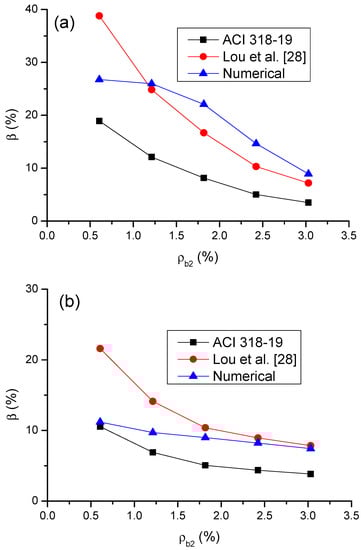 Figure 17 shows a comparison of the predicted moment redistribution by ACI 318-19 and Lou et al. [] equations with the numerical results. It is seen in Figure 17a that the equation by Lou et al. [] shows much more accurate predictions in moment redistribution in steel RC beams than the ACI 318-19 equation. However, at a low ρb2 of 0.61%, the equation by Lou et al. [] leads to an overestimate when calculating the moment redistribution in steel RC beams. In CFRP RC beams, the equation by Lou et al. [] is generally unsafe, although it leads to accurate predictions for ρb2 > 1.82%, as illustrated in Figure 17b. According to numerical simulations, the β–ρb2 relationship for CFRP RC beams is approximately linear. However, according to simplified equations by ACI 318-19 and Lou et al. [], the relationships exhibit an obviously nonlinear behavior with similar curve shape. This can be explained by the fact that both simplified equations are associated to the parameter εt, which varies with varying ρb2 in a nonlinear manner, as demonstrated in Figure 13.