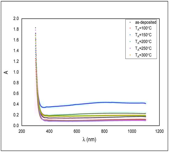 Figure 5 shows the absorption spectra of as-deposited ZnS thin films and annealed at temperatures of 100, 150, 200, 250, and 300 °C.