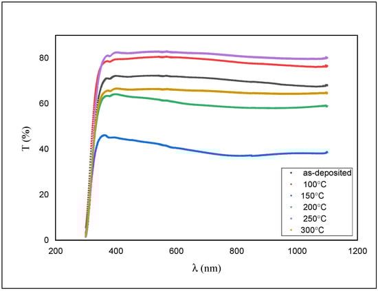As shown in Figure 6, the transmission is around 76% for the as-deposited film and diminished to ~50% with an expansion in the annealing temperature.