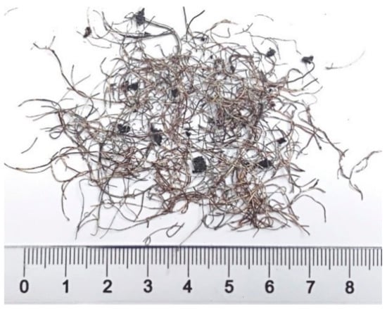 In general, randomly distributed short fibres improve the tensile strength and energy absorption capacity of concrete. The addition of fibres improve impact, fatigue, as well as fire and frost resistances of cement-based materials. Their effectiveness in the matrix strongly depends on the material (steel, polypropylene, glass, etc.), length and the shape (straight, hooked, crimped, etc.) [,]. The most effective are steel fibres, thus why various types of them are commercially available. The recycled steel fibres (RSF) from end-of-life tires differ from manufactured fibres with the stochastic length and diameter, and assorted shapes []. This is associated with the process of their reclamation and the type of the tires they are obtained from. Investigations on the impact of the RSF on mechanical properties of concrete have confirmed their usability to reinforce concrete [,,,,,,].