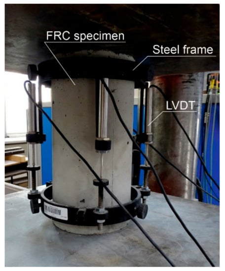 The compressive strength and modulus of elasticity were determined on cylindrical samples with a diameter of 150 mm and height of 300 mm. Six cylinders were prepared for each mix. The compression tests were carried out in a 3000 kN hydraulic testing machine according to EN 12390-3 []. The tests were performed applying a constant rate of displacement equal to 1 mm/min. The strains in the plain concrete specimens (mix C-0) were measured using 3 strain gauges. In the case of FRC, the strains were measured using the LVDTs mounted on the steel frame (Figure 2). For the FRC, the compression tests were performed with a constant rate of displacement to obtain the stress-strain curve after the achieving of the maximum load. This is a key, as the real influence of the fibres on the behaviour of the brittle matrix is observed in the post-peak regime of the stress-strain curve because the fibres bridge the cracks.