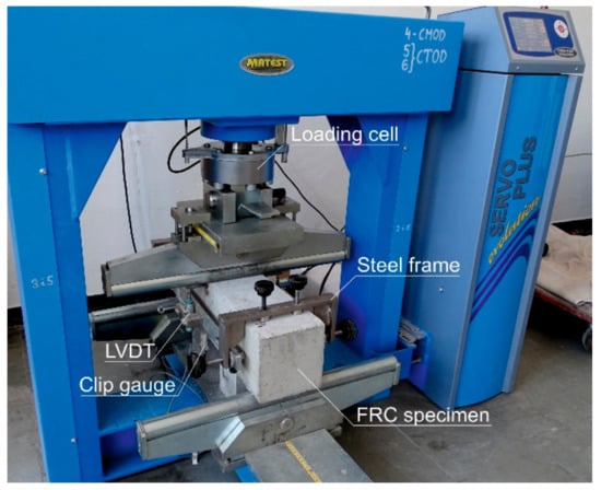 The flexural behaviour of FRC was analysed in a three-point bending test with notched beams with a dimension of 150 × 150 × 600 mm according to EN 14651:2007 []. The notch depth was equal to 25 mm. The flexural tests were performed on 4 specimens per mix. The deflection rate during the tests was equal to 2 mm/min. The tests were performed till the midspan-deflection reached 5 mm. The crack mouth opening displacement (CMOD) was measured during the tests. The view of the setup for flexural tests is presented in Figure 3.