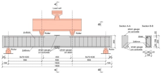 During the tests, the strains of the longitudinal bottom bars were measured. The strain of the beam surface was measured in the compression and tension zones. The strain gauges were glued to the beam—its arrangement is schematically presented in Figure 4. In the RC beams, the strain gauges were also placed on the side surface at the depth corresponding to the location of the longitudinal bars. The deflection of the beam in the middle and under the points where the load was applied were measured using LVDTs. The support positions were also controlled by the LVDTs.