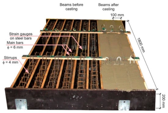 The RC beams were reinforced with two bottom longitudinal bars with a diameter of 6 mm and partially reinforced with upper longitudinal bars with a diameter of 6 mm at the support zones. The tensile reinforcement ratio was equal to 0.32%. The concrete cover was equal to 15 mm. The stirrups were only added in the shear zone of the beam, protecting it against shear failure. The shear reinforcement consists of stirrups with a diameter of 4 mm spaced every 70 mm (Figure 4). The strain gauges were mounted on the bottom steel bars at the midpoint of the beam. The view of the beams in the multi-station cast before and after casting is presented in Figure 5.