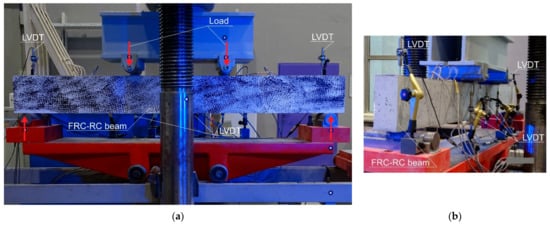 FRC-RC beams during the four-point test: (a) front view; (b) back view.