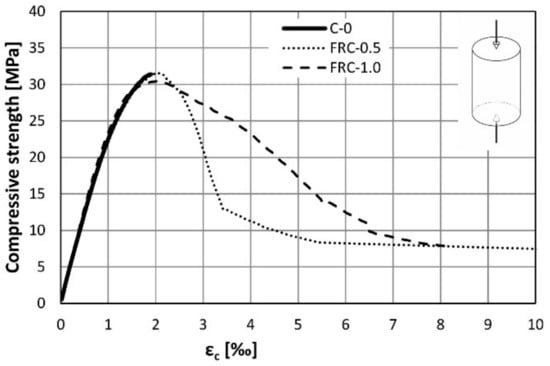 The results of the compression tests are presented in Table 5. The coefficient of variation (in percent) is shown in the parentheses. The addition of fibres had no noticeable effect on the compressive strength and the corresponding strain of the concrete. It confirms the expectations that the fibres slightly affect the compressive stress transfer mechanism. All average strain-stress curves are almost identical in the ascending part. Some influence of the fibres is visible on the post-peak part of the stress-strain curve—see Figure 7. The FRC exhibited the ability to carry the loads after achieving the peak point. The slope of the descending part of the curve was dependent on the fibre content, where an increase of the number of fibres was found to lower the softening rate.