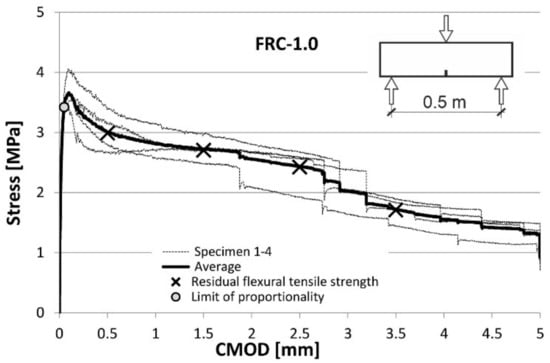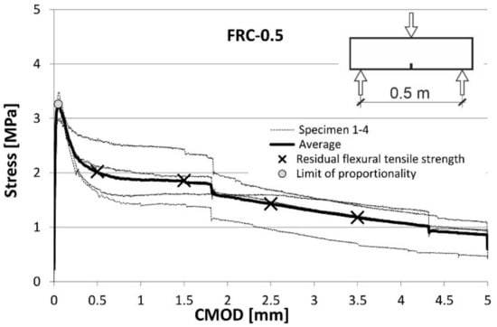 The parameters obtained from the tests are the flexural tensile strength at the limit of proportionality (fL) and the residual flexural tensile strengths (fR,i) at the four values of crack mouth opening displacement (CMOD): 0.5 mm, 1.5 mm, 2.5 mm and 3.5 mm. All these values are presented in Figure 8 and Figure 9. A description of the method applied for stress calculation can be found in another author’s publication []. All basic tensile properties are summarized in Table 6.