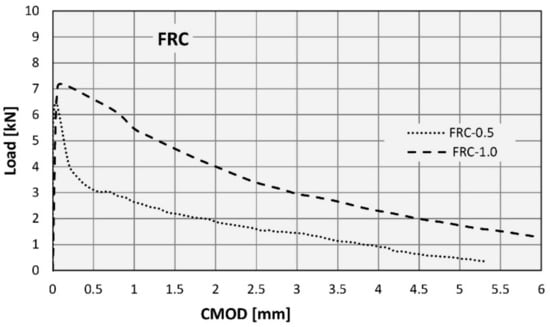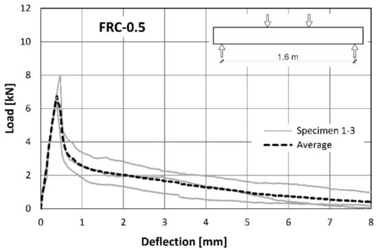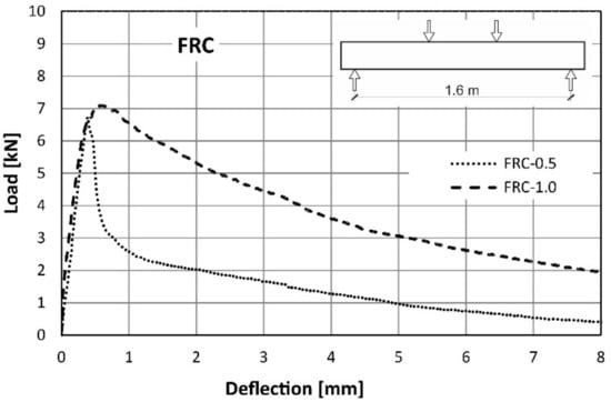 Direct comparison of the average curves presented in Figure 10 and Figure 11 is also presented in the Figure 12. It can be concluded that the load-bearing capacity of both types of beams was comparable. The slightly higher value for the maximum load was noted for the beams with the higher amount of the fibres (Table 7). The mid-span deflection corresponding to the maximum load was two times bigger for FRC-1.0 than for FRC-0.5 (Table 7). However, in the case of FRC-1.0, a higher scatter of results was observed (Figure 11). The influence of both amounts of fibres was noted in the post-peak regime of the load-deflection curve. Generally, in the case of samples reinforced with RSF (FRC-0.5), a significant softening after reaching the peak load was noted. The higher number of fibres (FRC-1.0) caused some hardening before the maximum load capacity was achieved and mild softening in comparison to FRC-0.5. FRC beams with a higher fibre content were found to withstand the load carrying capacity much longer. This is clearly related to FRC’s ability to retain tensile stress after cracking. For example, when the deflection reached the value of 2 mm, the load applied to the FRC-0.5 beam was 2.0 kN, while for FRC-1.0 it was more than twice as much and amounted to 5.3 kN. This confirms that an increase in the number of fibres, leads to an increase of efficiency in the post-peak phase. The detailed results of the structural tests are summarized in Table 7.